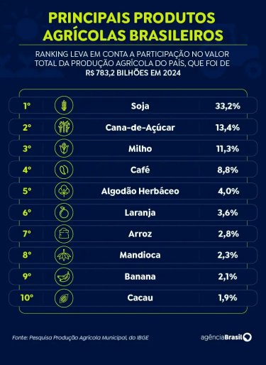 Com isso, a cana-de-açúcar responde por 13,4% do ranking de 2024 divulgado pelo Instituto Brasileiro de Geografia e Estatística (IBGE).